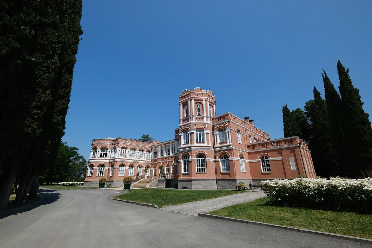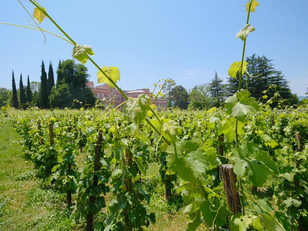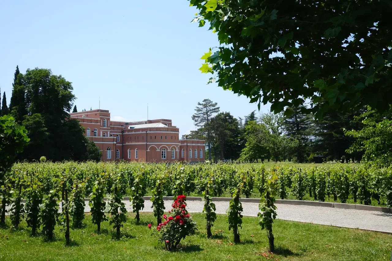 А еще в Мухрани есть удивительный винный арт-объект (пожалуй, можно назвать его именно так) – Chateau Mukhrani. Настоящий винный замок, построенный по образу и подобию французских шато на рубеже 19 и 20 веков, когда владелец этих мест, князь Иванэ Багратион-Мухранский, решил делать в Грузии вина на европейский манер. До него технология виноделия здесь не менялась с самого своего возникновения (родина вина, как мы помним, как раз здесь, в Закавказье) – врытые в землю квеври, в которые засыпалось все, что было на винограднике. Да, сейчас работа с глиной – передовой и модный подход в виноделии, но тогда никаких техник и технологий в традиционном грузинском виноделии не было, так что князь Мухранский отнюдь не слепо следовал моде, а именно что старался вывести местное виноделие на новый уровень.